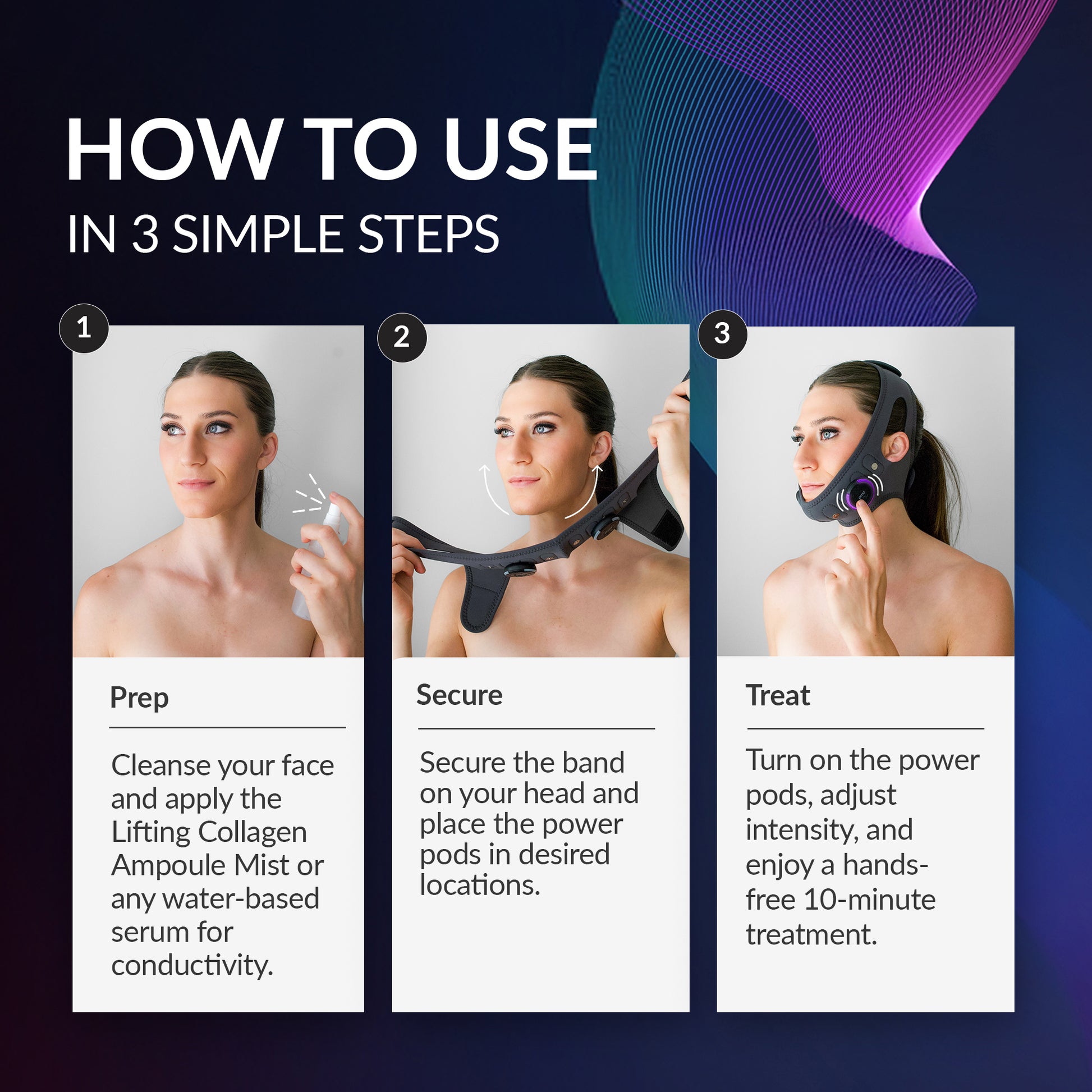 Follow our simple step-by-step guide to get the most out of your PMD Lifting Massage Band. For best results, use daily for 10 minutes to lift, sculpt, and firm. Choose your preferred intensity, and be sure to clean the band after each use to maintain optimal performance.